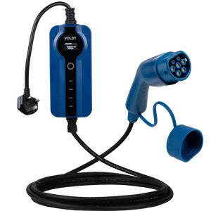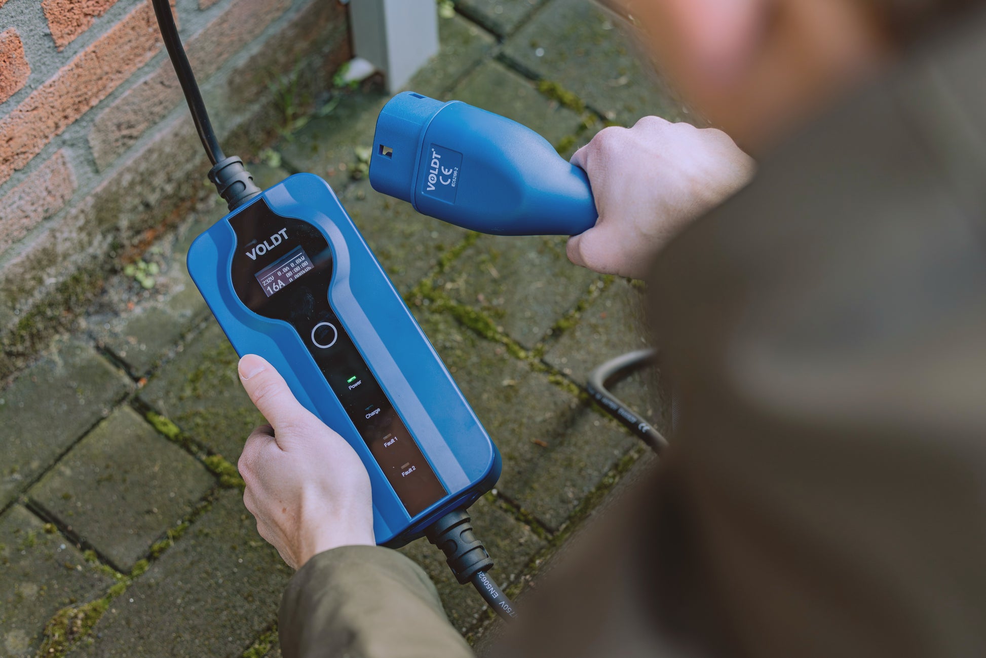 O Voldt carregador EV de 3 pinos | Ajustável 8A - 13A | Cabo de carregamento de 2,8kW é projetado e fabricado na Europa. Com ele, você pode carregar seu carro com segurança em tomadas domésticas no Reino Unido.